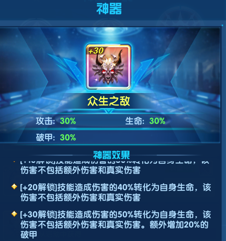 众生之敌的属性和神器效果都没有增加暴击和暴伤属性,而只增加了破甲攻击属性,故而可以判定此神器不适合一切暴击暴伤流路线的英雄,而只适合走破甲攻击流路线的英雄。