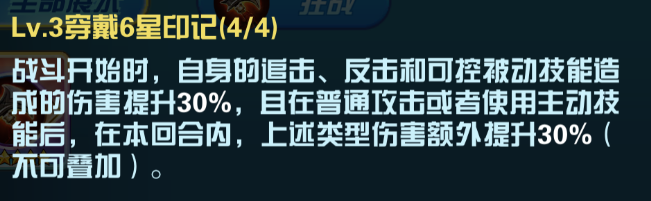 每行动一次获得一层5%伤害+5%免伤,最多获得6层,下个回合最多获得30%伤害,30%免伤。